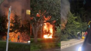 Créditos: Capturas redes sociales En la noche del sábado 11 de abril, un incendio en una zona de vegetación obligó a la rápida reacción de vecinos y autoridades en la localidad de Usaquén. El hecho ocurrió en la calle 127 con carrera 15, en inmediaciones del centro comercial Unicentro Bogotá, donde las llamas alcanzaron una
